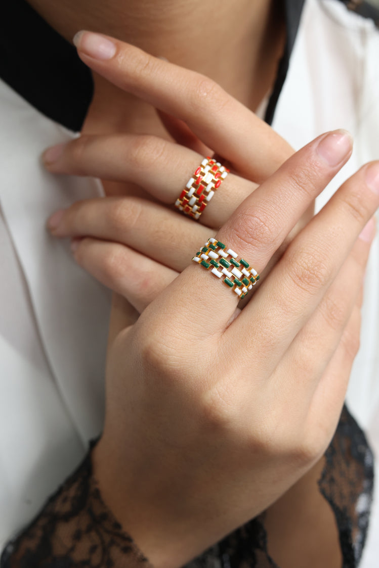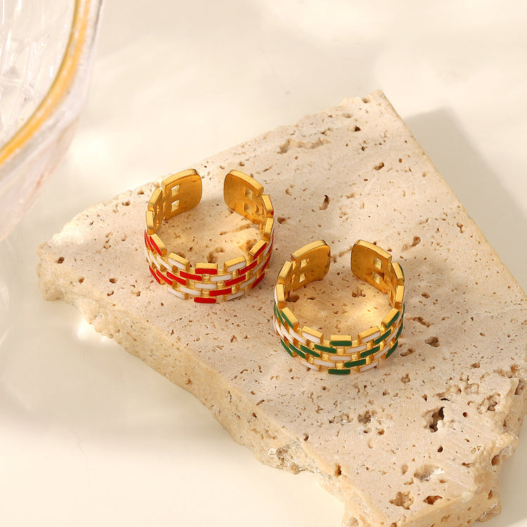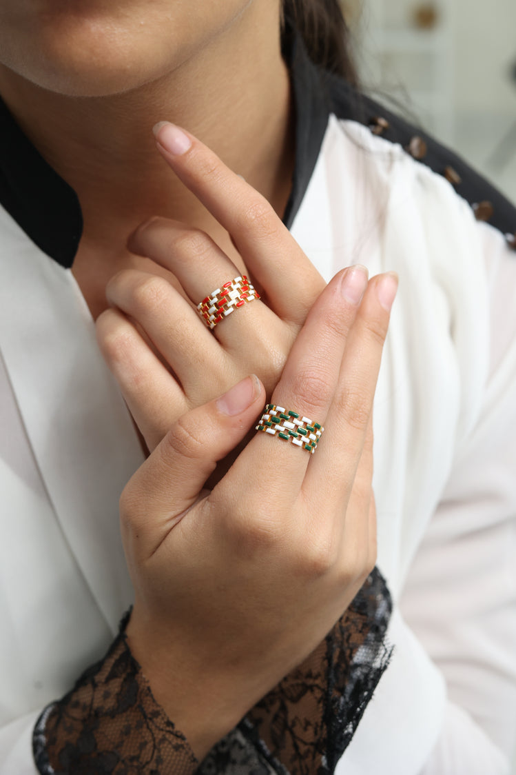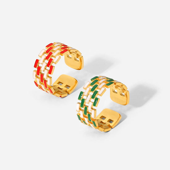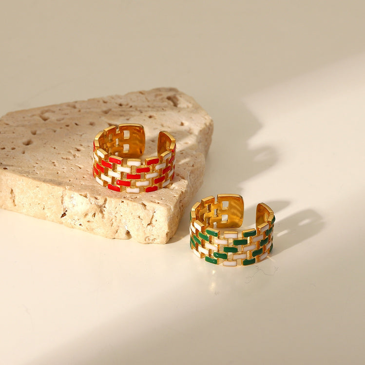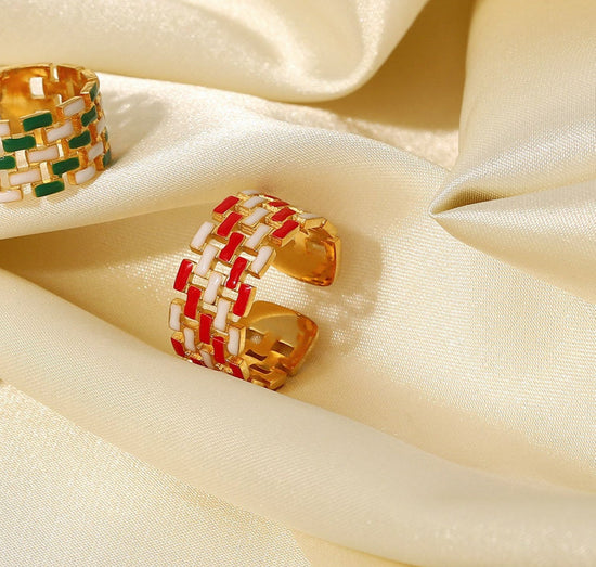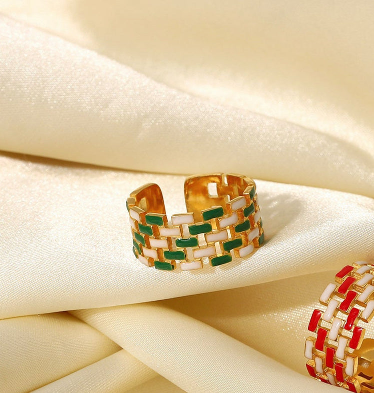 Bold and artful, the Tiled Muse ring features a mosaic of enamel tiles set in a adjustable waterproof wide gold-tone band. Adjustable and statement-making, it’s a wearable piece of modern art for your fingers.