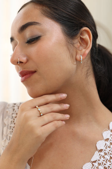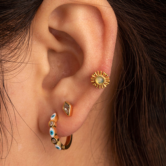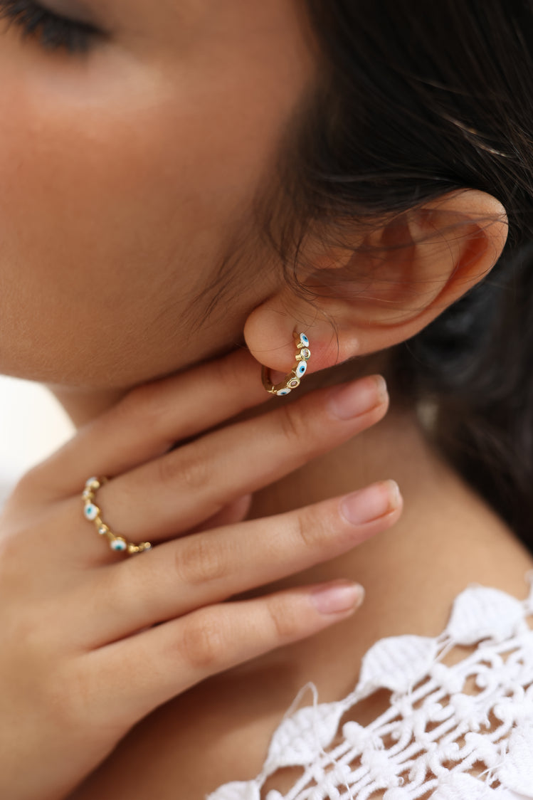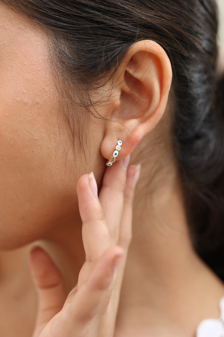 Aura Shield Huggie Hoops with enamel evil eyes—crafted in 18k gold plated, stainless steel, enameled, and tarnish resistant for lasting shine and protection.