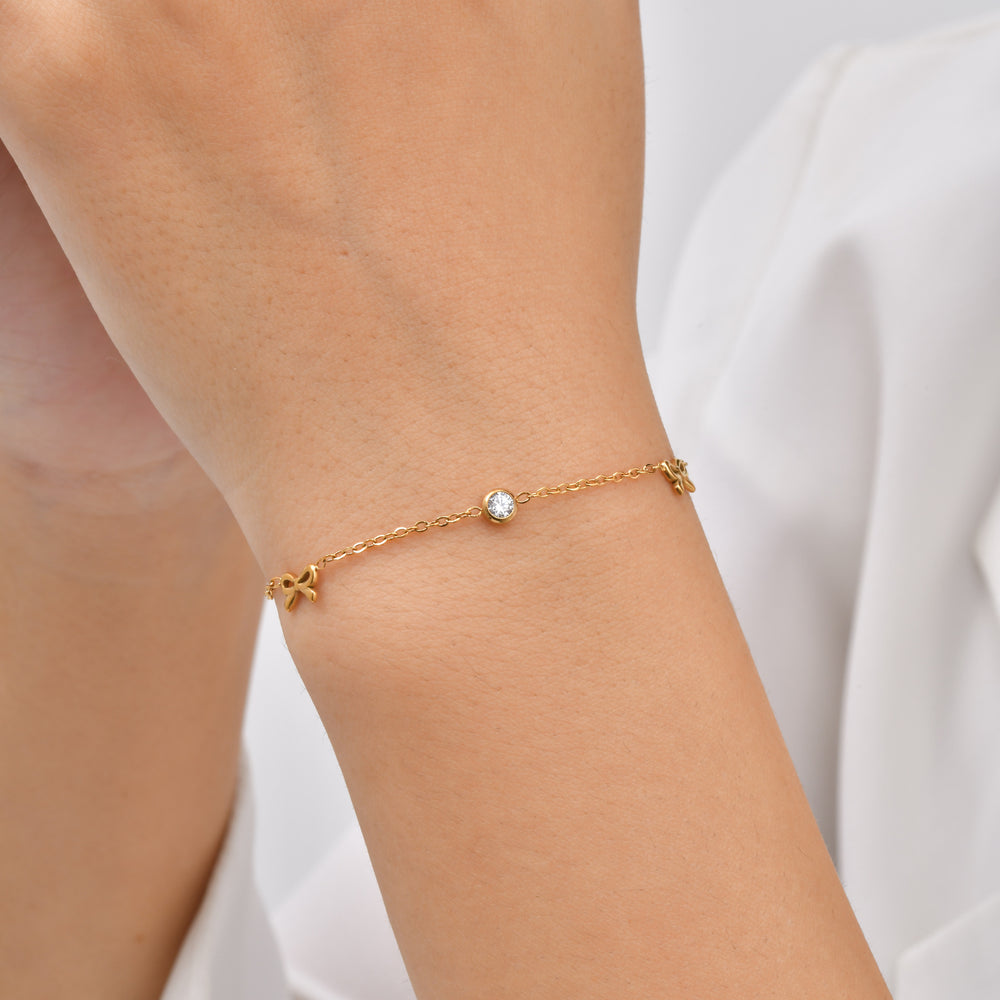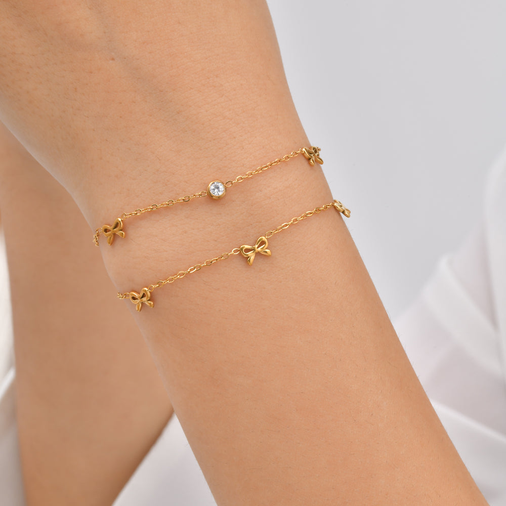 Tied up in the sweetest details. The Bow & Glow Bracelet features a delicate gold chain with a tiny bow accent and a sparkling center stone for just the right hint of shine. It’s dainty, stackable, and perfect for everyday love notes on your wrist. Soft sparkle. Sweet statement! Layer it up with our Sweet Bow Bracelet.