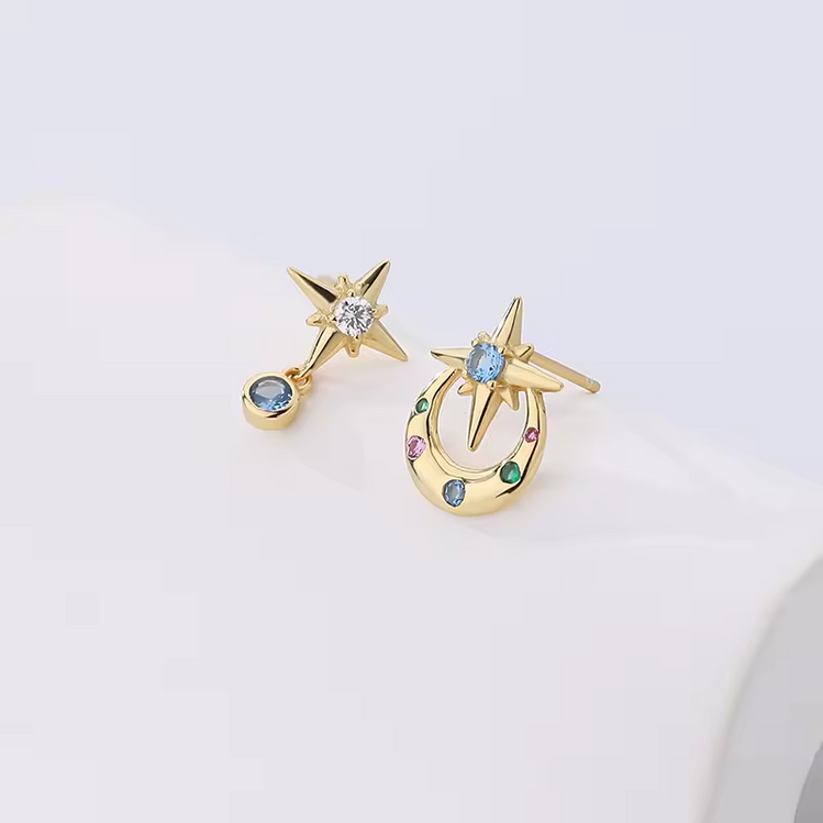 - Moon and Star, Irregular Ear Studs, Multi color Zircons