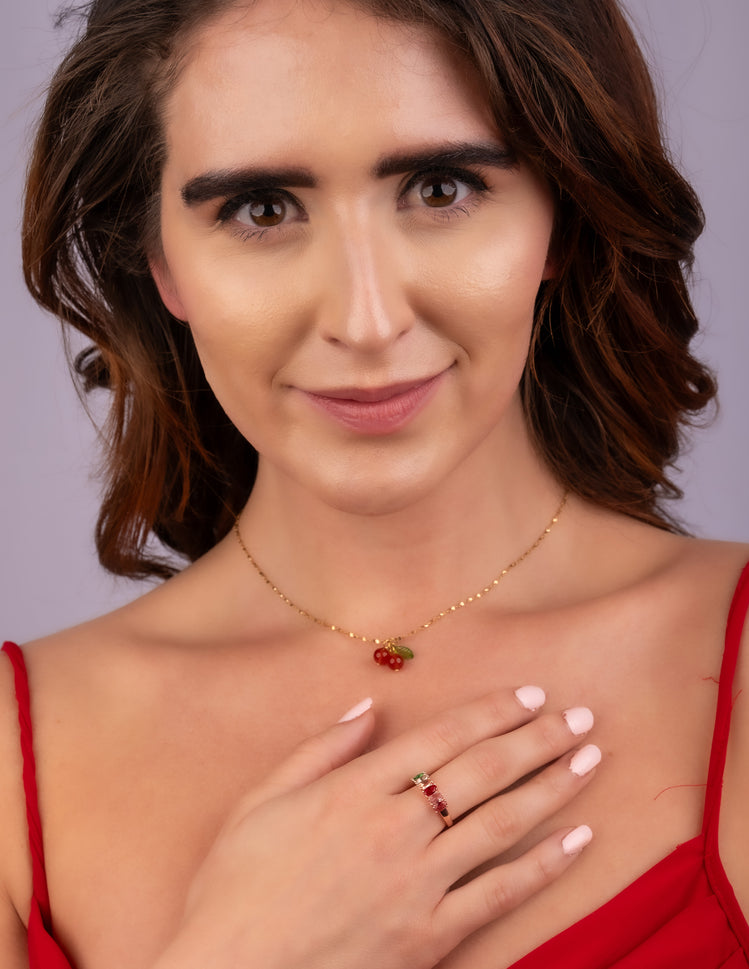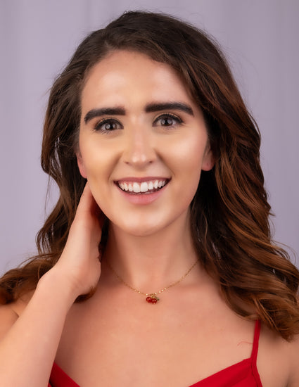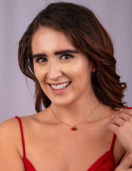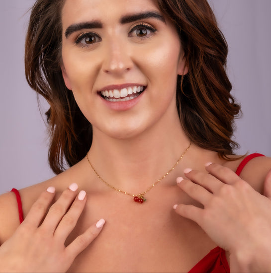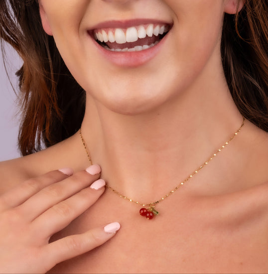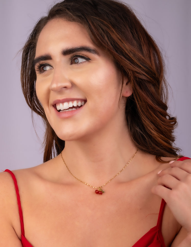 A sweet golden chain crowned with two glossy cherries, this Waterproof necklace is the perfect playful cherry on top of any look.