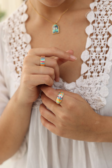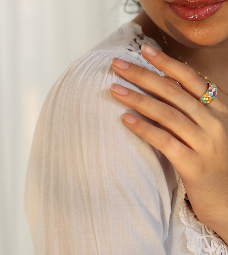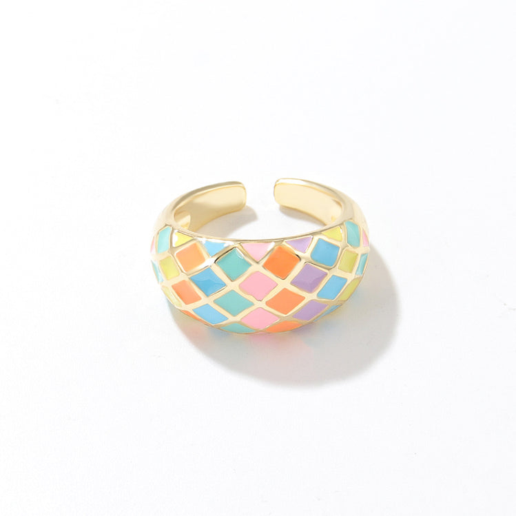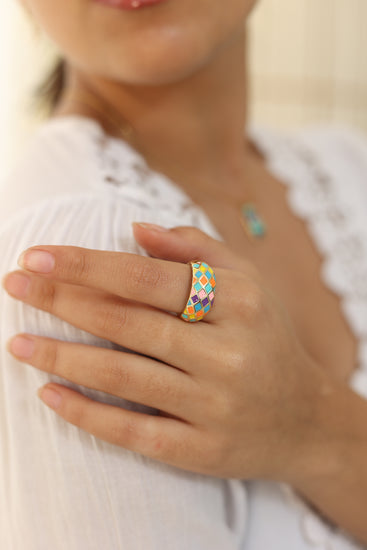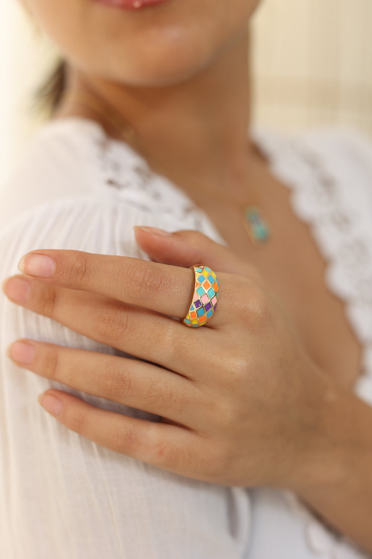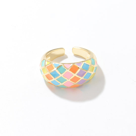 Fun, fresh, and full of color, the Confetti Spark ring features a playful harlequin pattern in pastel enamel shades on a gold-tone band. Adjustable and vibrant, it’s your perfect party-for-your-fingers accessory.
