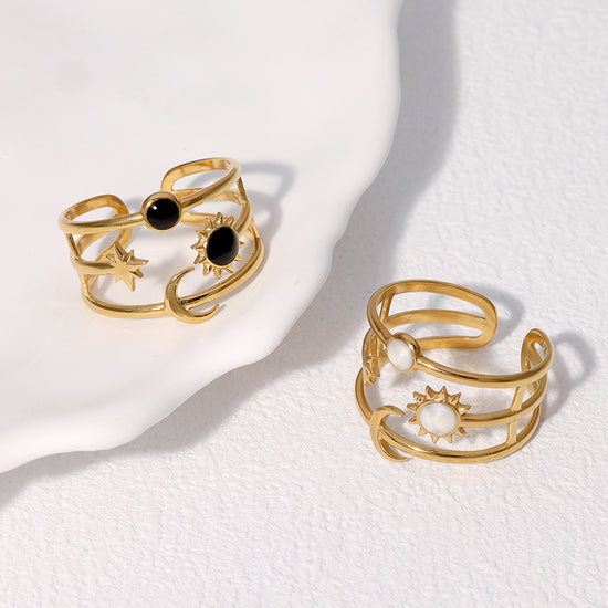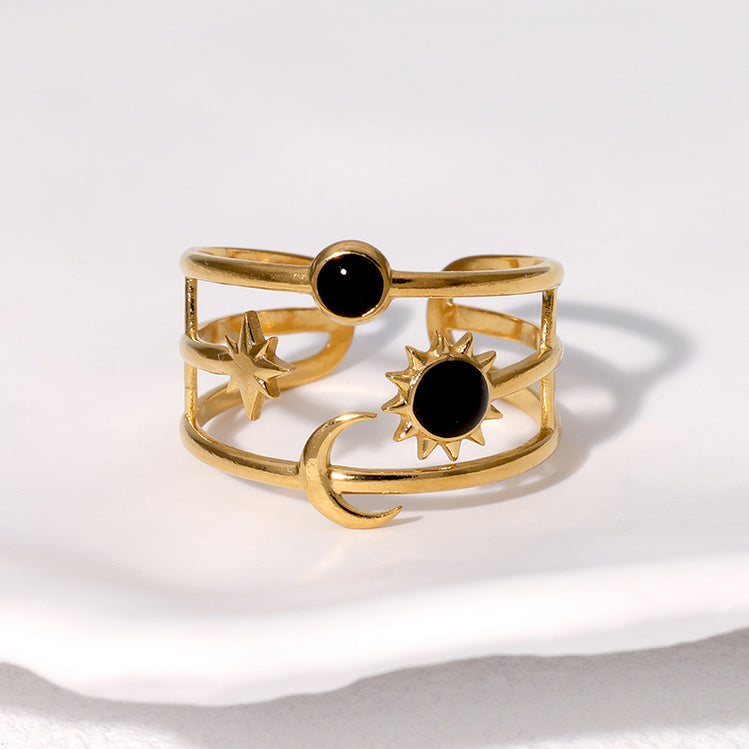 A playful spin through the stars this gold-tone ring trio swirls with celestial magic, featuring moons, stars, and sun motifs for a dreamy, cosmic statement. Adjustable, bold, and made to shine.