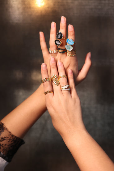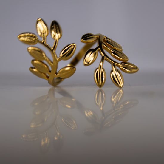 A leafy little crown for your finger, this waterproof beauty lets you rule your day (and the weather) with golden, nature-kissed charm.