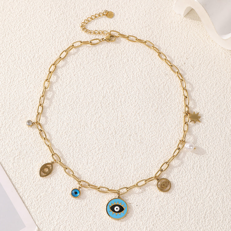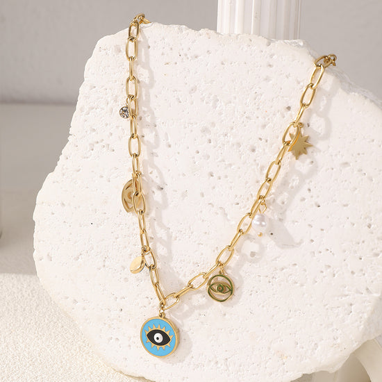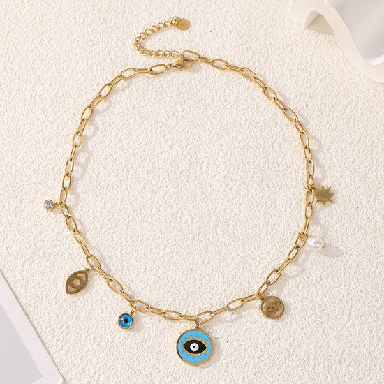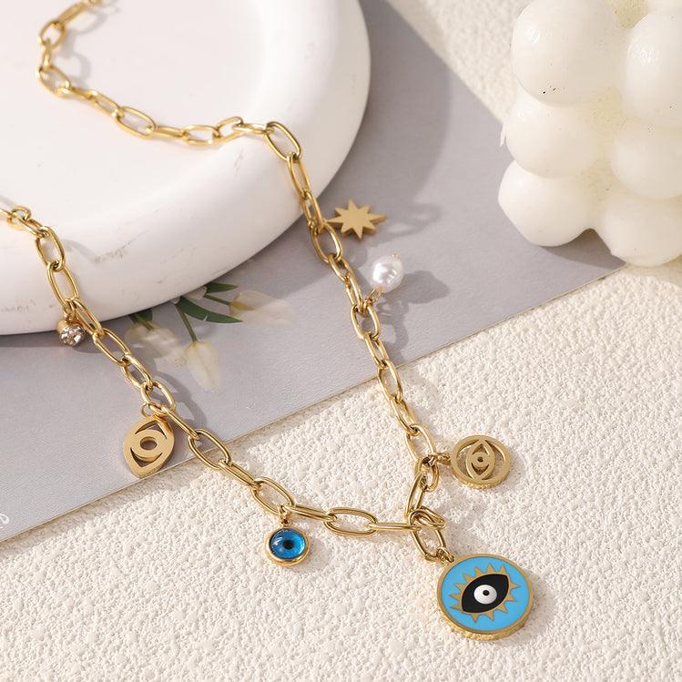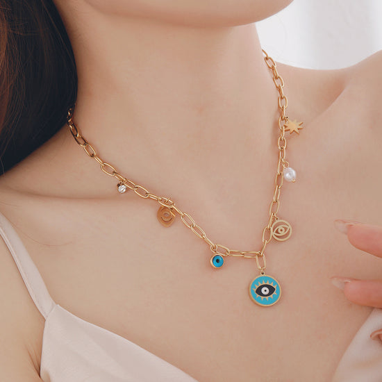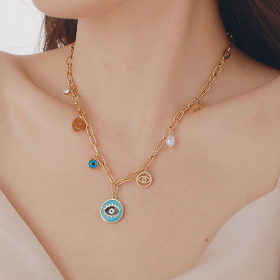 A charm-laced necklace that keeps all eyes on you, sparkling with golden accents and a watchful turquoise gaze.