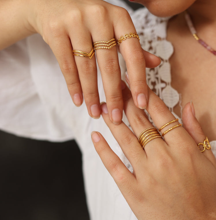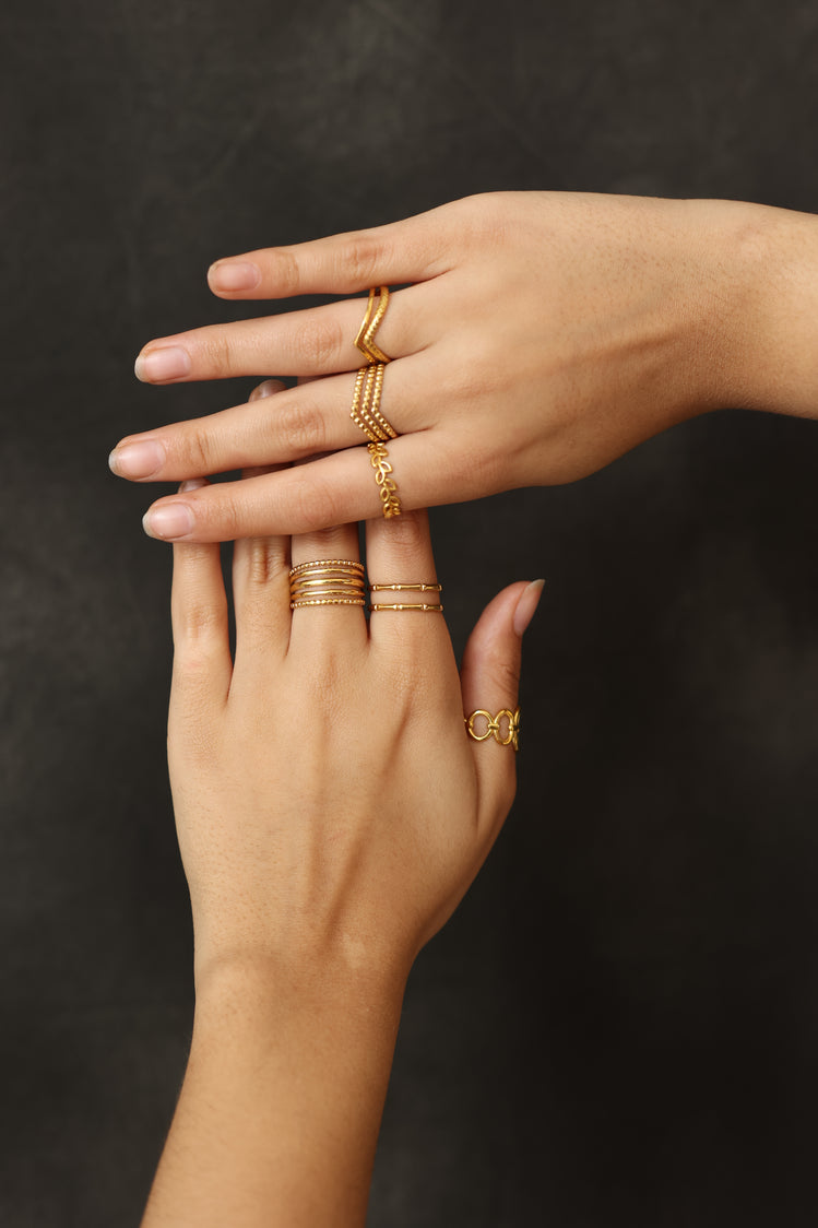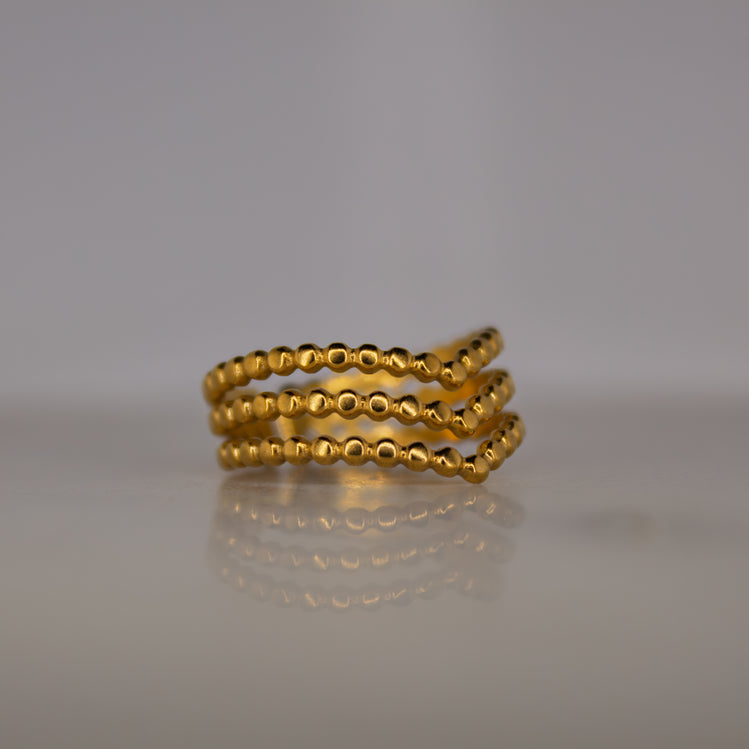 Simple, sleek, and effortlessly stylish, the Golden Muse ring features three rows of polished beaded texture for a refined yet playful finish. Lightweight, waterproof, and adjustable, it’s your everyday sparkle with timeless charm.