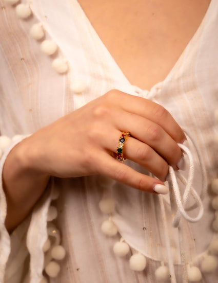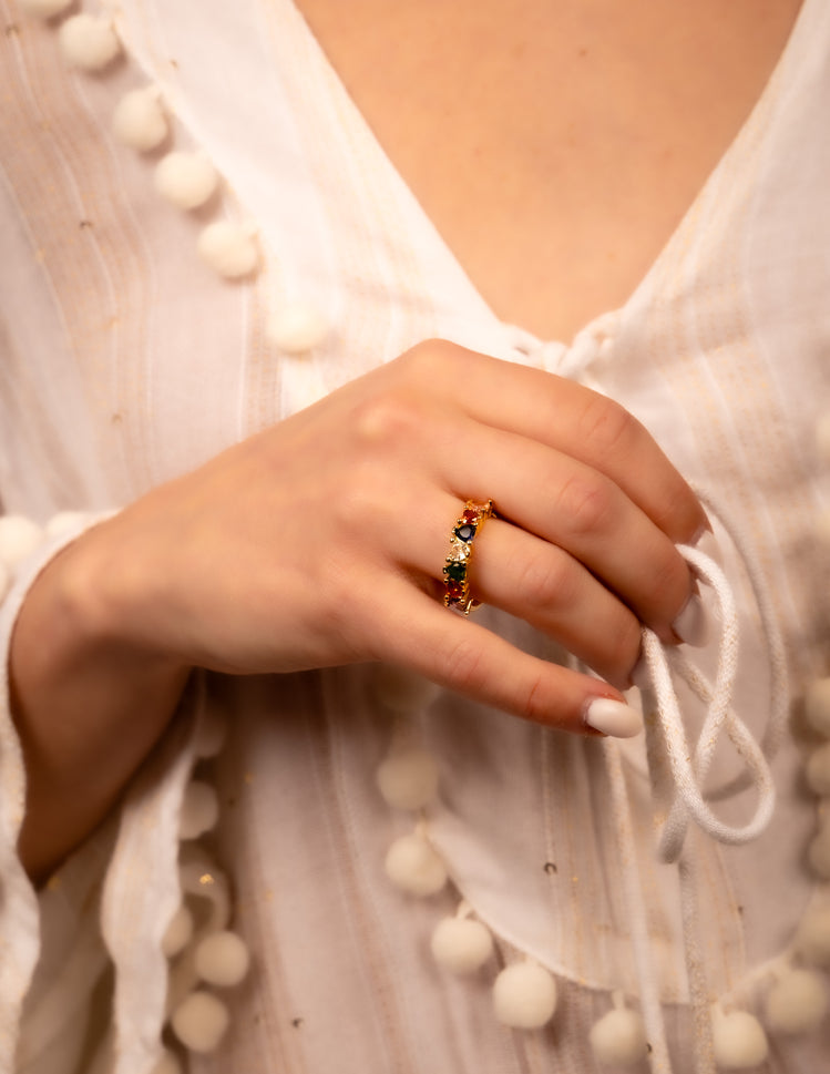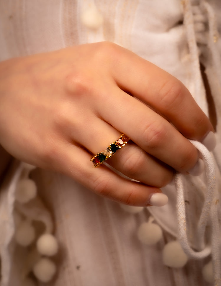 A parade of sparkling heart-shaped stones in every color of joy, this ring is your little wearable rainbow. Perfect for adding a pop of color and love to any outfit, because one heart is never enough.