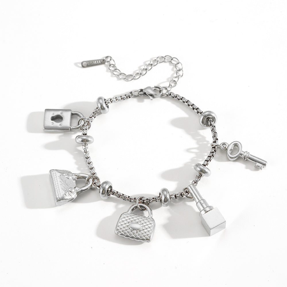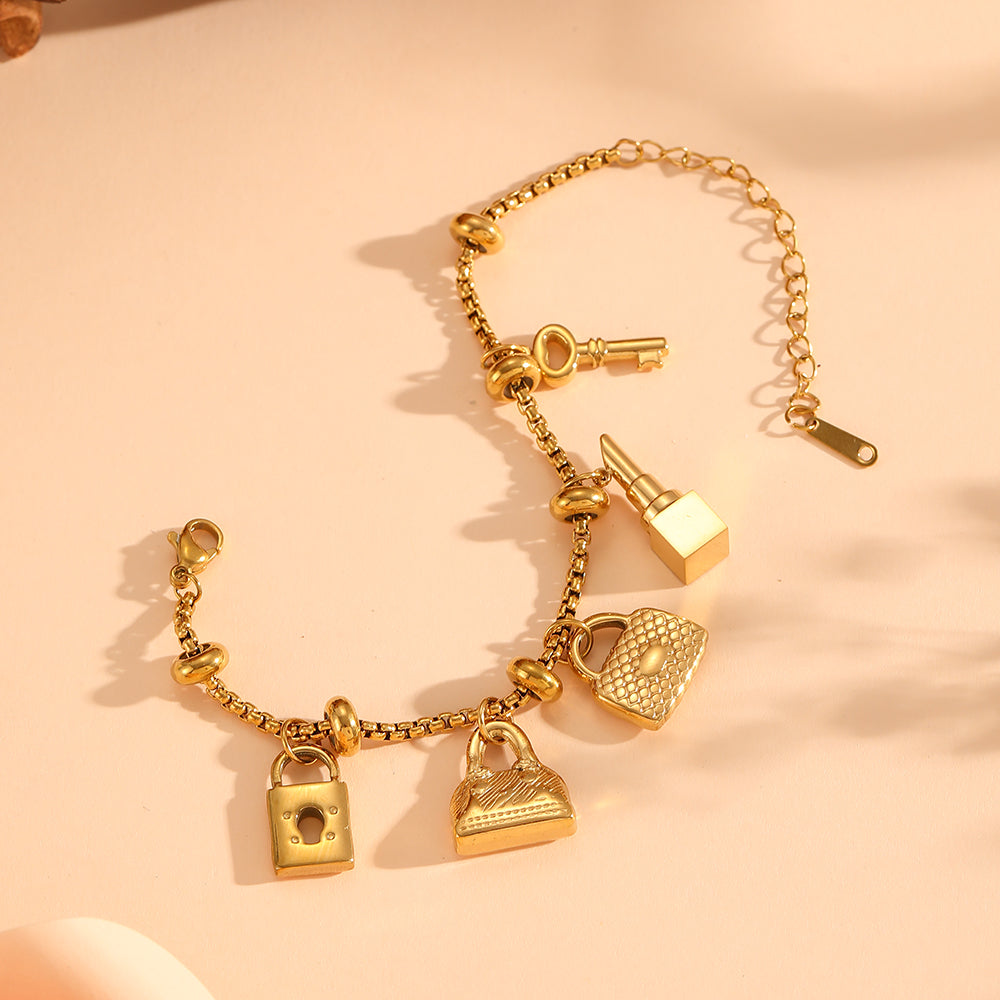 A bold gold chain detailed with playful bag, lock, and key charms, the Key Pieces Bracelet brings personality and polish to everyday styling. Designed to feel confident and collectible, it’s a statement piece that works just as well solo as it does stacked.