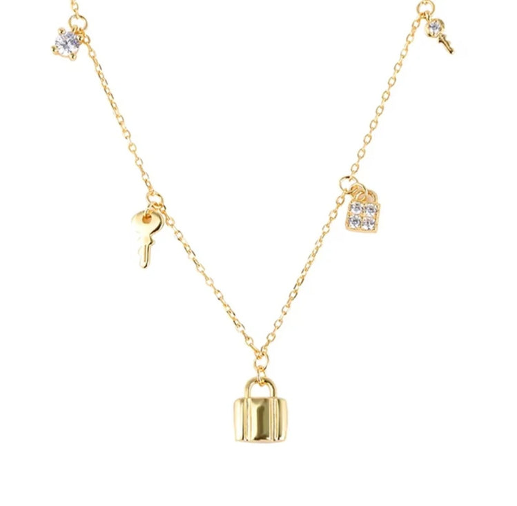 A modern take on timeless romance. Crafted in 925 sterling silver, this delicate charm necklace features a curated mix of symbolic charms—including a heart, key, and lock, designed to tell a story of love, connection, and individuality. Lightweight and effortlessly elegant, it’s perfect for everyday wear or layered for a more elevated look.