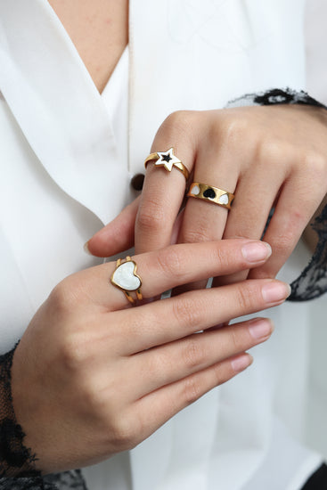 A heart with attitude—this open band beauty features a luminous enameled heart cradled in gold, shaped like love (but a little sassier). Wear it as a cheeky reminder to love yourself first, always.