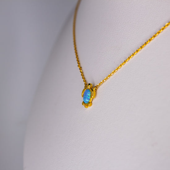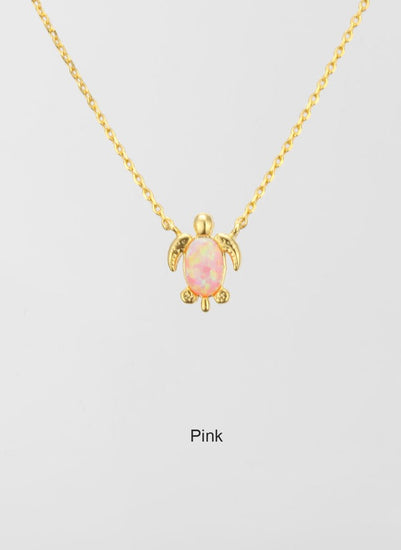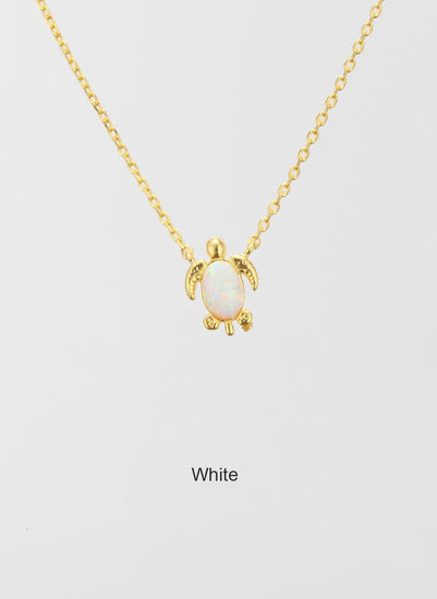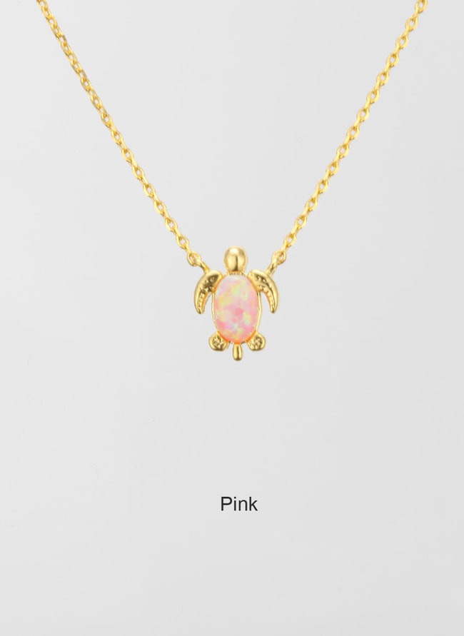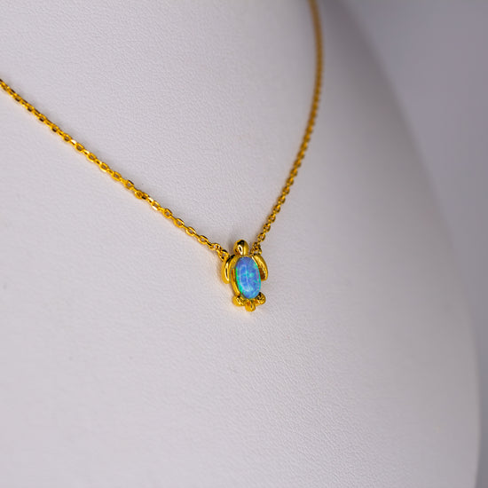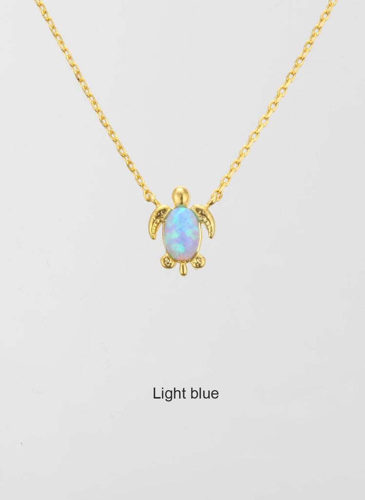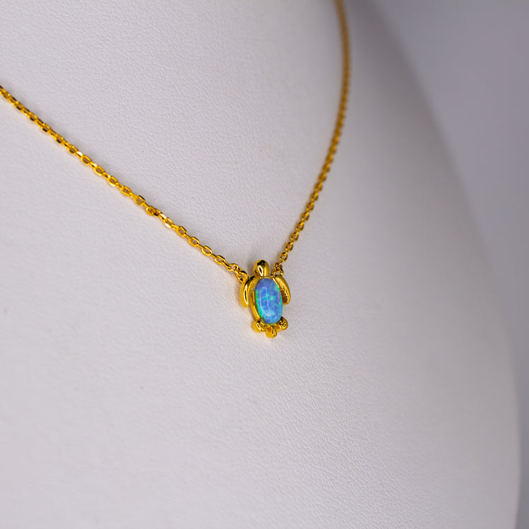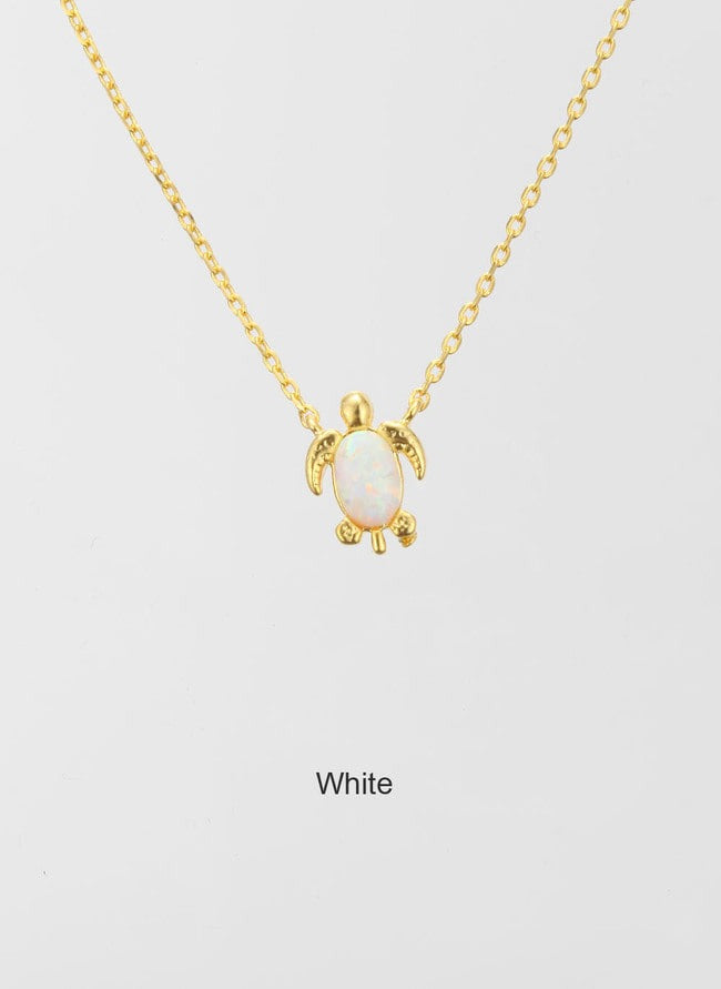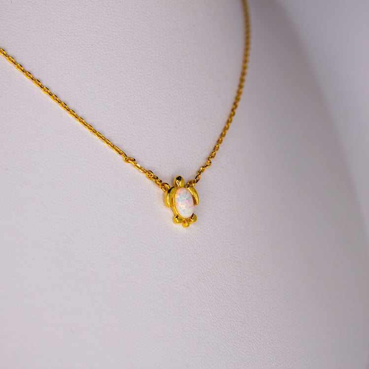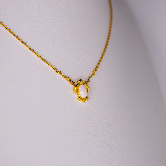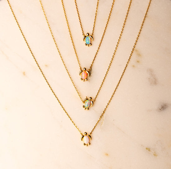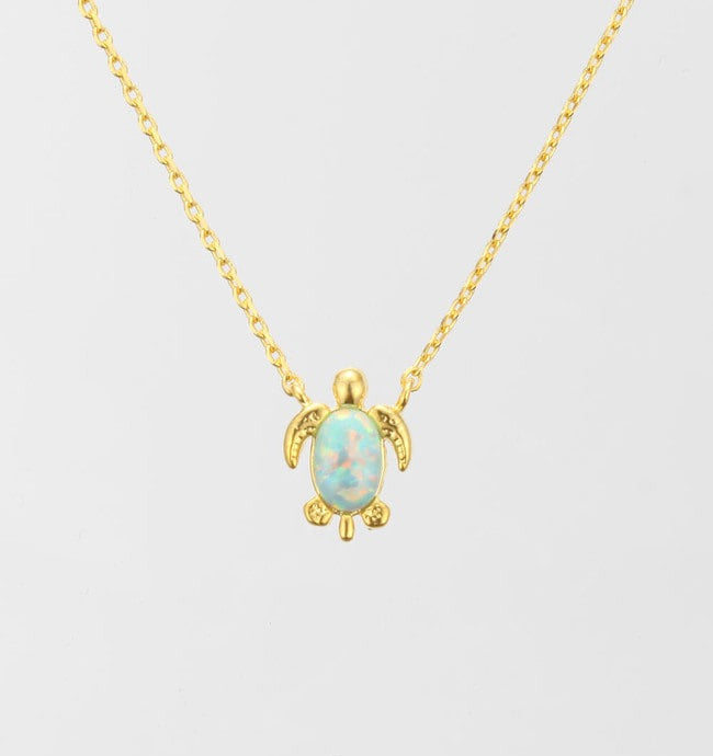 A tiny golden turtle with a shimmering opal shell, this necklace paddles through your neckline like a little wave of whimsy and wonder.