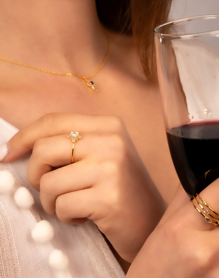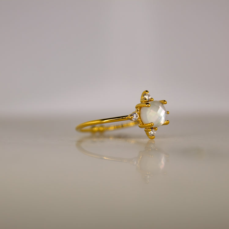 Catch the moon, keep the sparkle. A flirty open band that wraps your finger in stardust and lunar glow, crowned with a dreamy mother-of-pearl stone for that extra celestial charm.