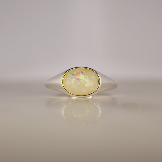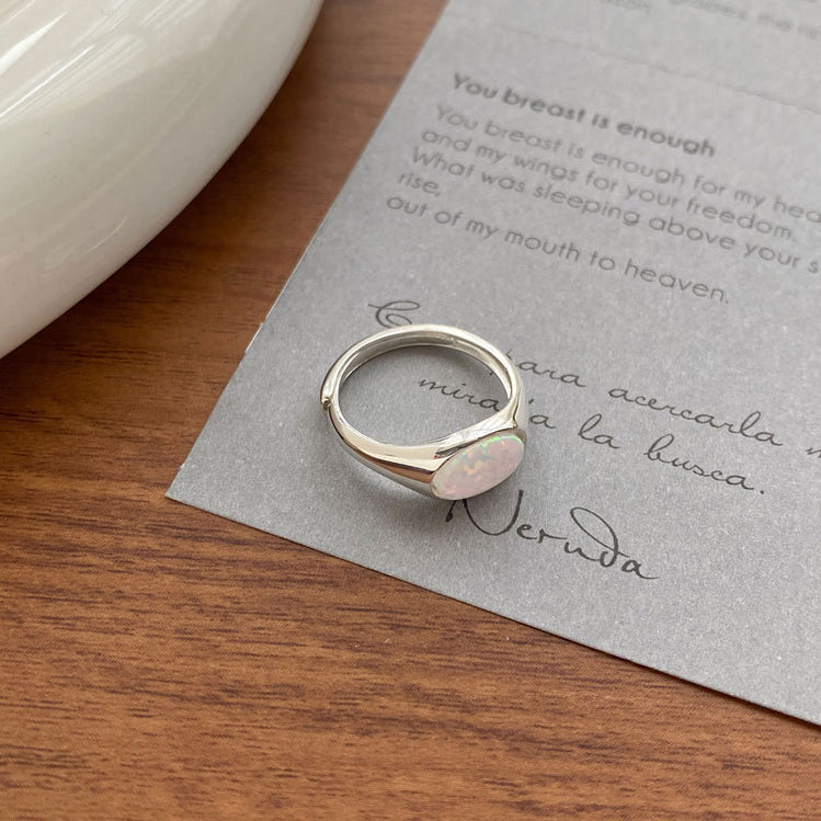 A sleek silver-tone band cradles a luminous opal, glowing with soft, iridescent hues. Moonveil Ring is a minimalist statement that captures the quiet magic of moonlight in every glance.