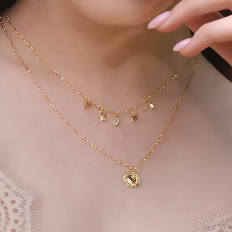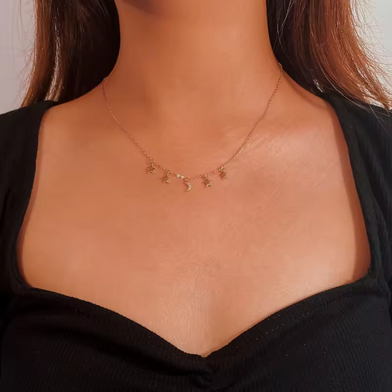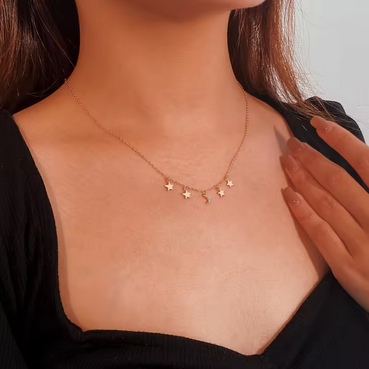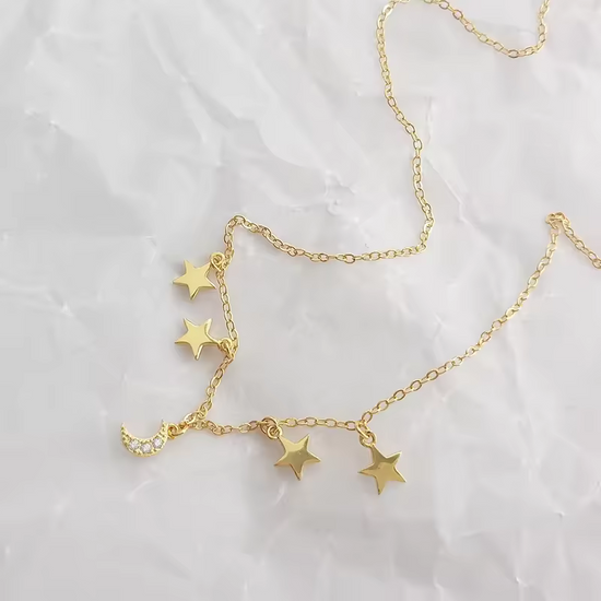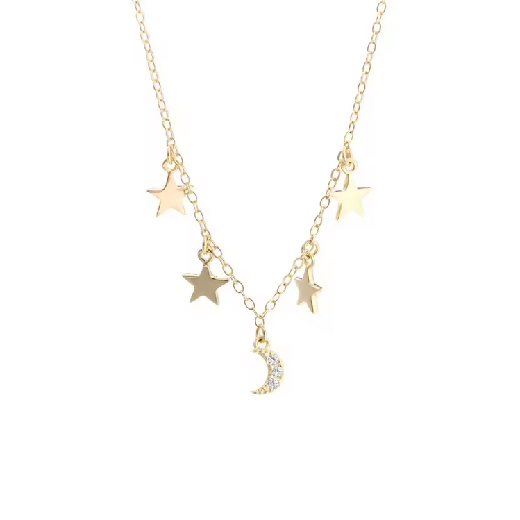 A golden chain of twinkling stars and a crescent moon, this necklace plays all the right moony tunes for your style.