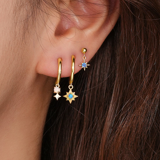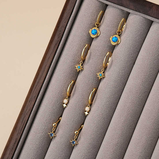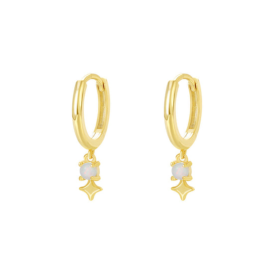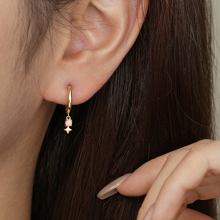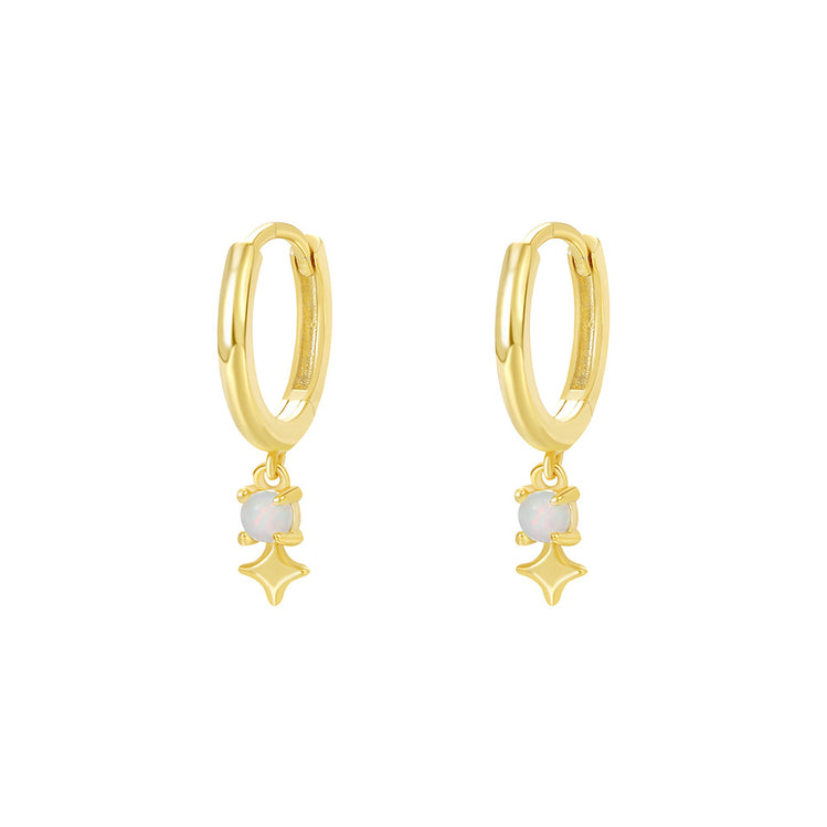 Golden Huggie hoops with dangling Opals, these earrings shimmer with a soft glow and a touch of celestial charm.