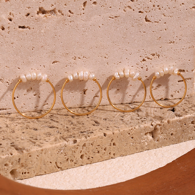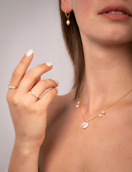 Playful and poised, this ring features a row of real freshwater pearls that love to catch the light—and compliments. A flirty twist on a timeless classic, ready to stack or shine solo.