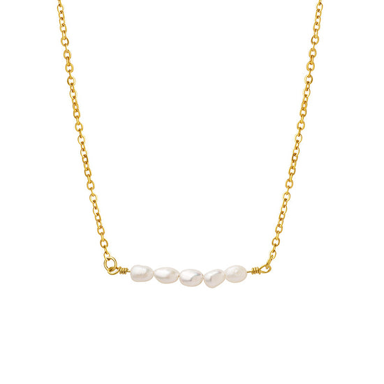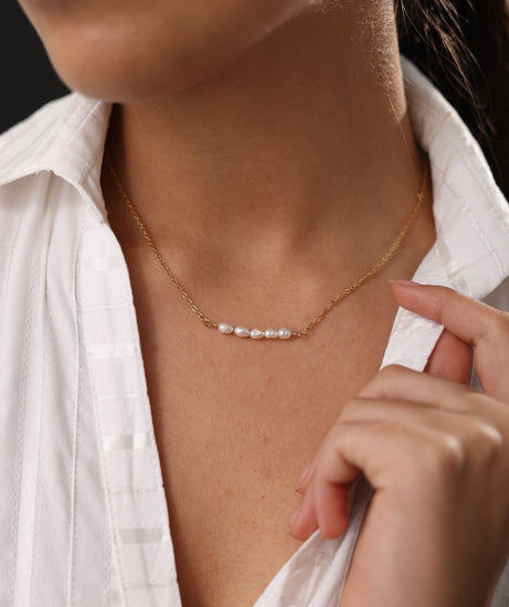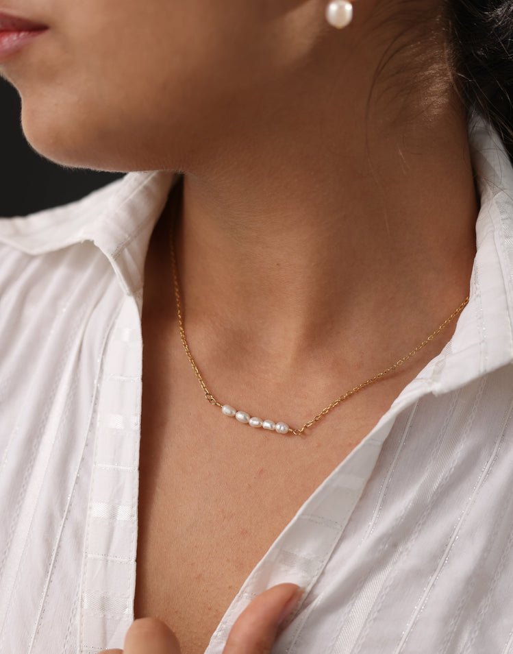A cheerful row of lustrous pearls strung on a golden chain, this Waterproof necklace brings a fresh and playful twist to timeless elegance.