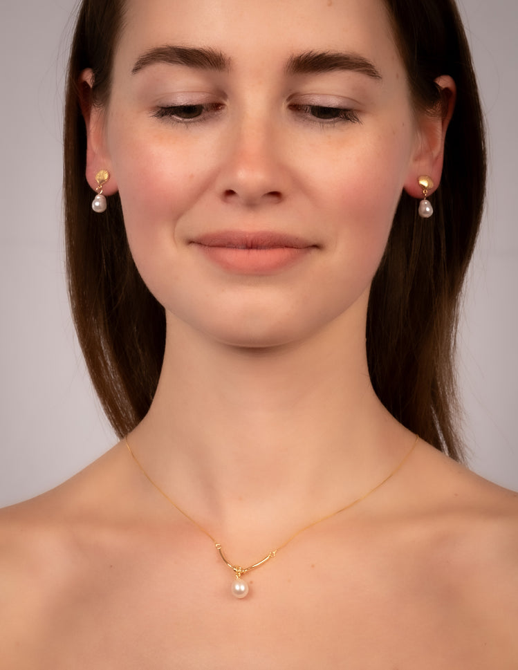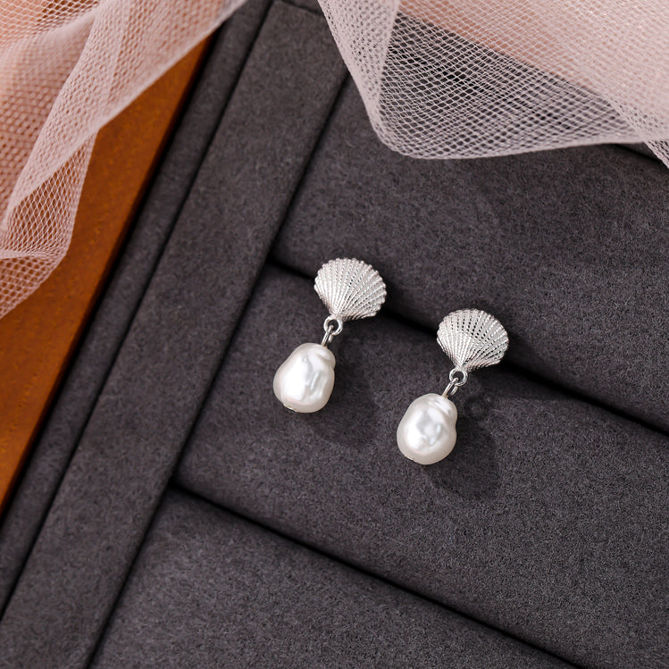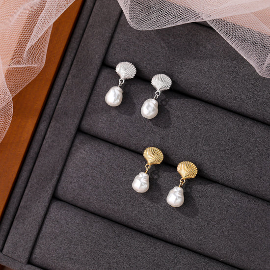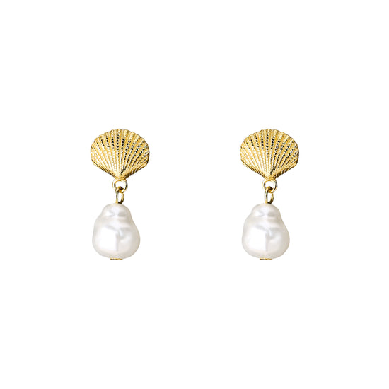 Elegant stud earrings featuring textured golden seashell tops paired with dangling irregular freshwater pearls, evoking a chic coastal charm.