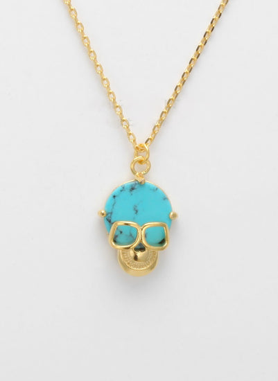 A turquoise skull rocking golden shades, this necklace is spooky, sassy, and effortlessly cool all at once.