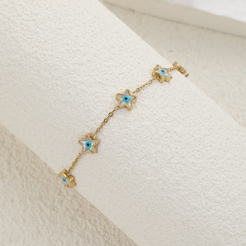 Delicate star motifs designed as protective charms are spaced along a fine gold chain in the Star Guard Bracelet. Accented with soft color and subtle sparkle, it’s an everyday piece meant to be worn as a quiet symbol of good energy. Pairs beautifully with our evil eye jewelry.