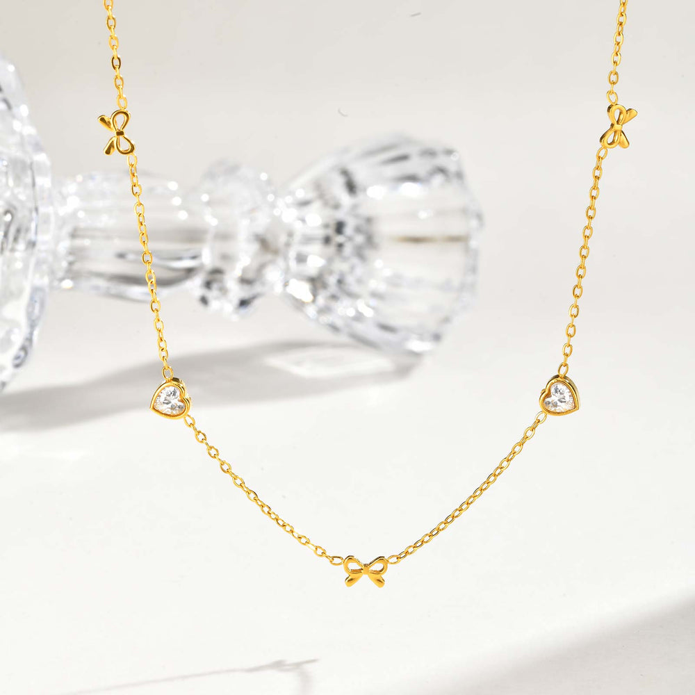 A delicate gold chain accented with a subtle central sparkle and tiny bow details. Lightweight and effortlessly elegant, this necklace is designed for everyday wear perfect worn solo or layered with your favorites.
