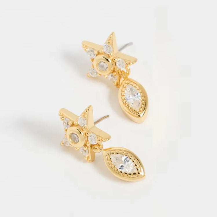 Radiant gold-tone stars adorned with sparkling crystals cascade into teardrop charms, adding a celestial touch of elegance to your style.