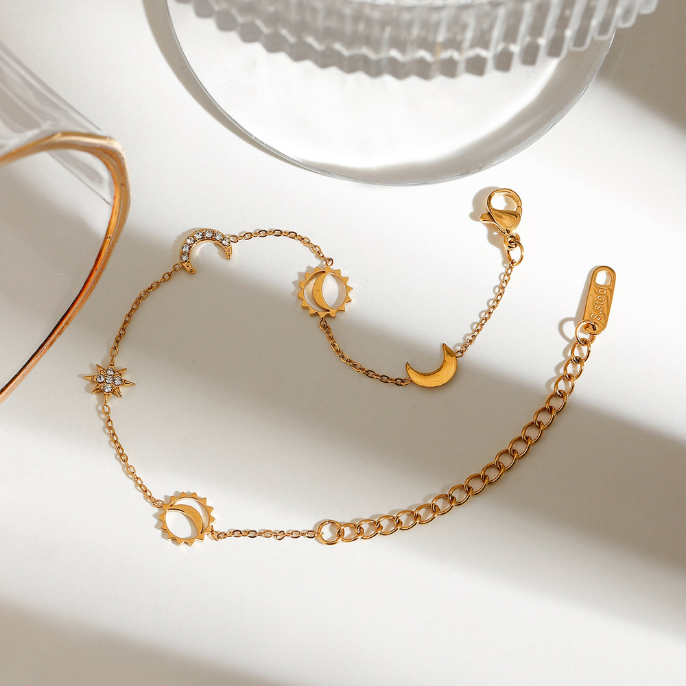 A delicate mix of celestial charms: sun, moon, and shimmer come together on a fine gold chain to create a bracelet that feels effortless and luminous. Designed for everyday wear with a touch of magic. Layers perfectly with our Charms Edit Bracelet.