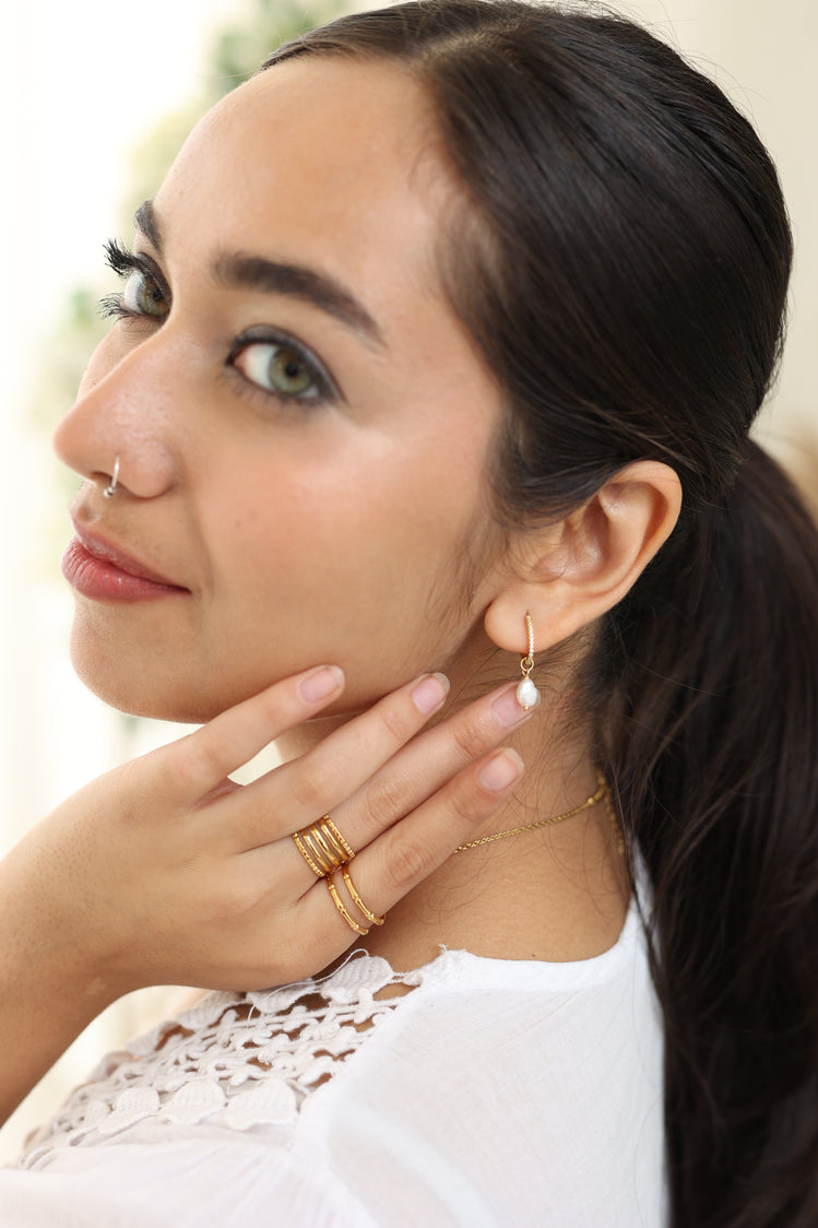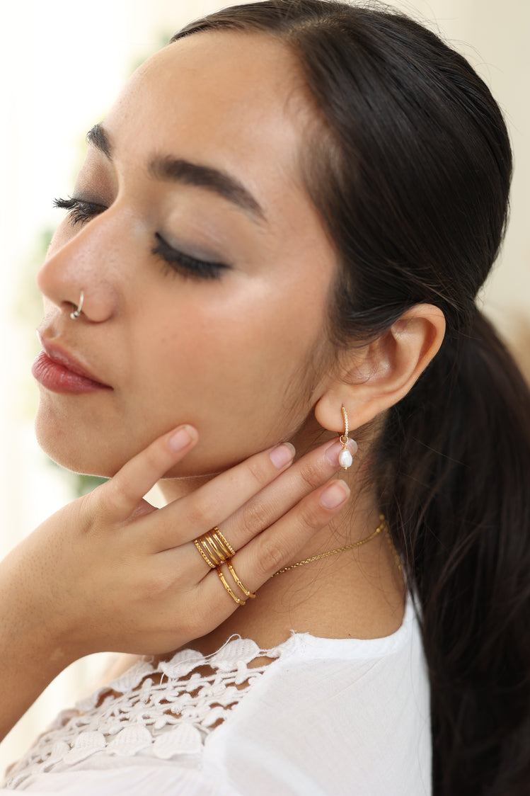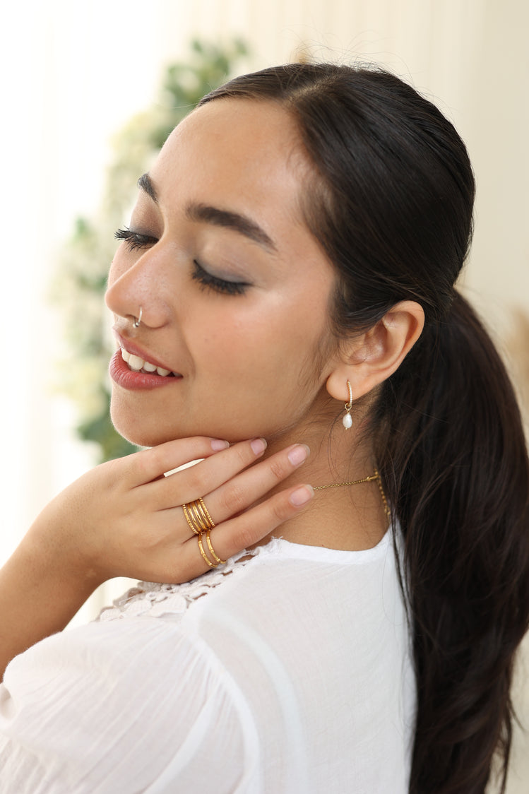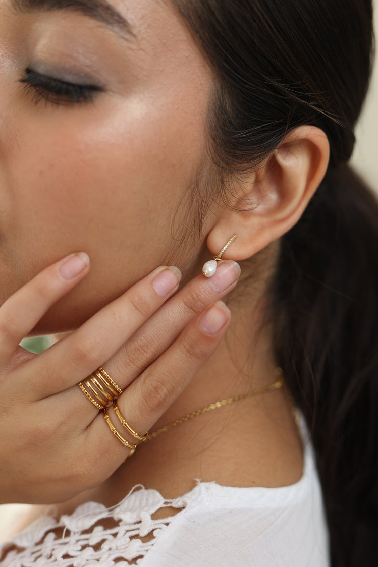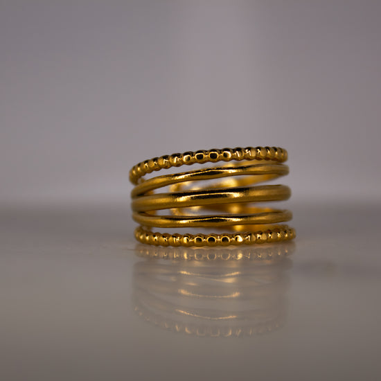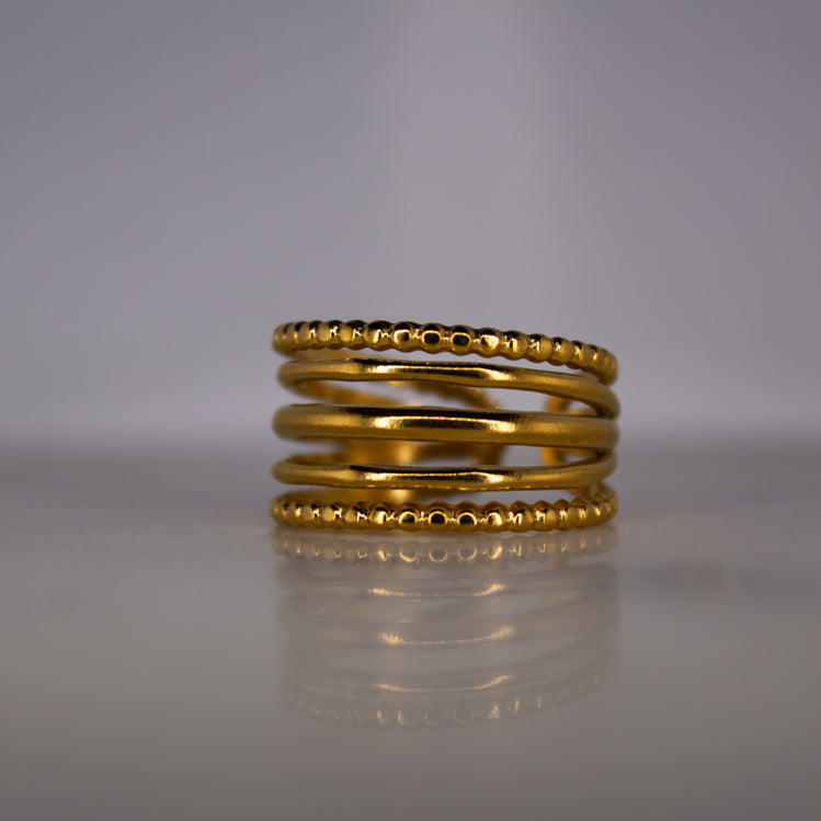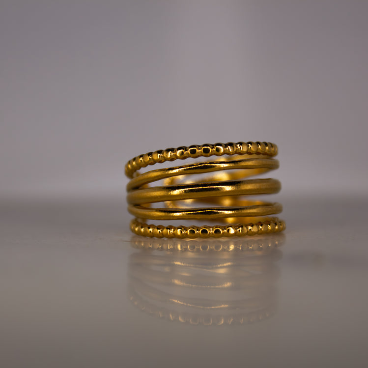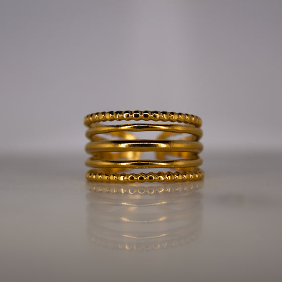Bold, structured, and timeless, The Empire Ring commands attention with its layered ridges and intricate beaded edges. Crafted in a rich gold-tone finish, this waterproof and adjustable piece is a modern classic built for power moves and polished style.