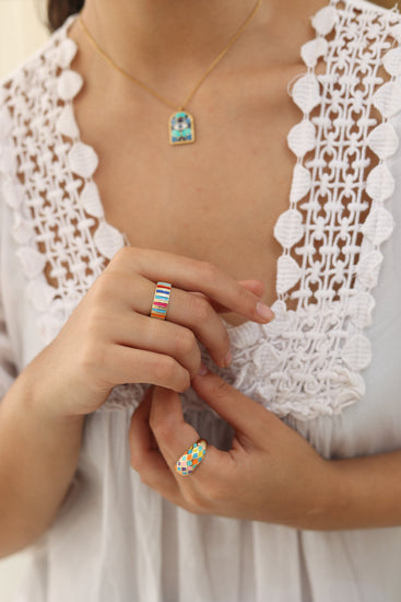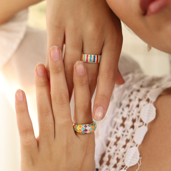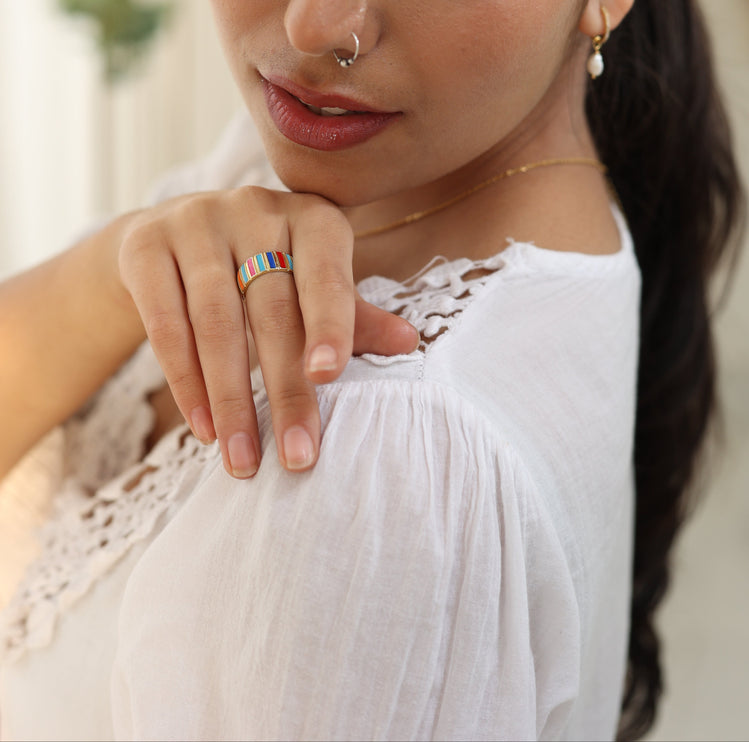 Colorful and carefree, the Vibe Ring bursts with rainbow enamel stripes on a bold gold-tone band. Adjustable and full of personality, it’s the perfect piece to bring a playful pop to any outfit.
