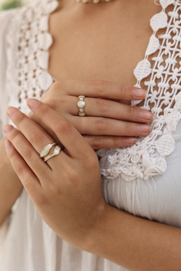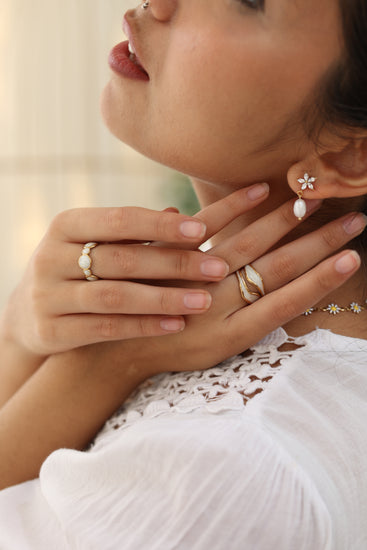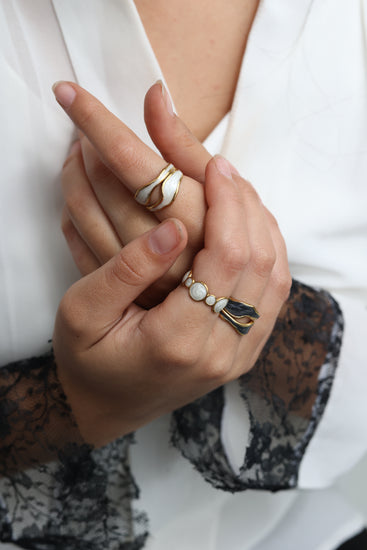Graceful and glowing, the White Aura ring radiates quiet elegance with its soft white enamel in organic, rounded forms. Framed in a luxurious waterproof gold-tone setting, it’s a minimal yet striking piece that adds a touch of serenity to your everyday style.